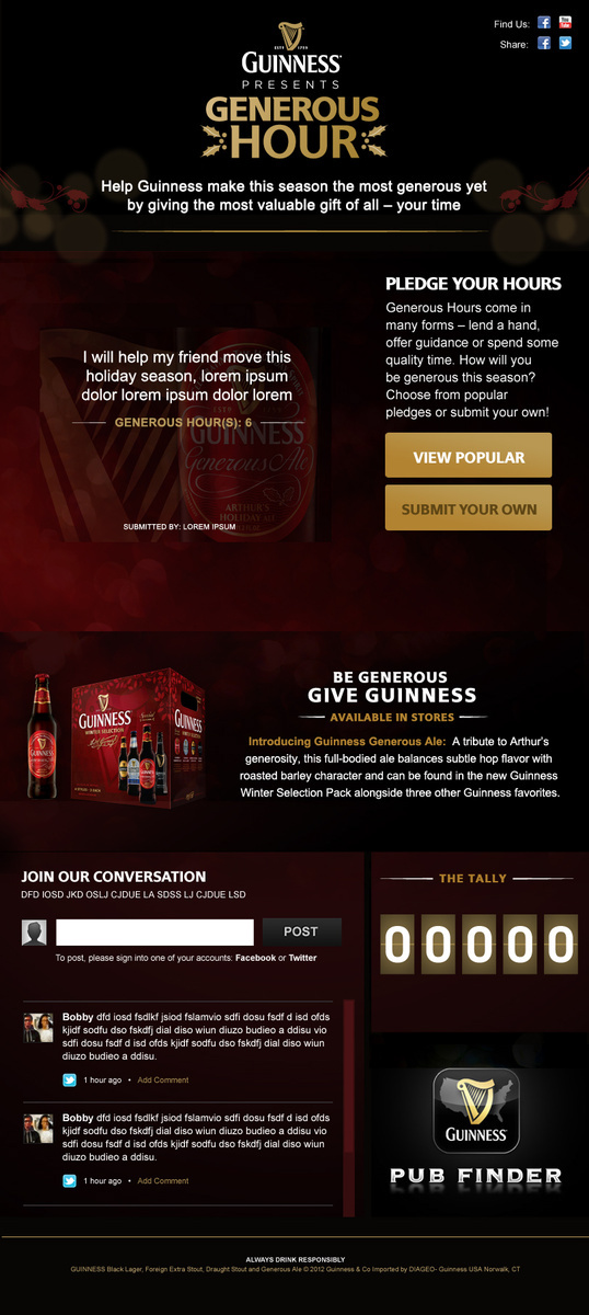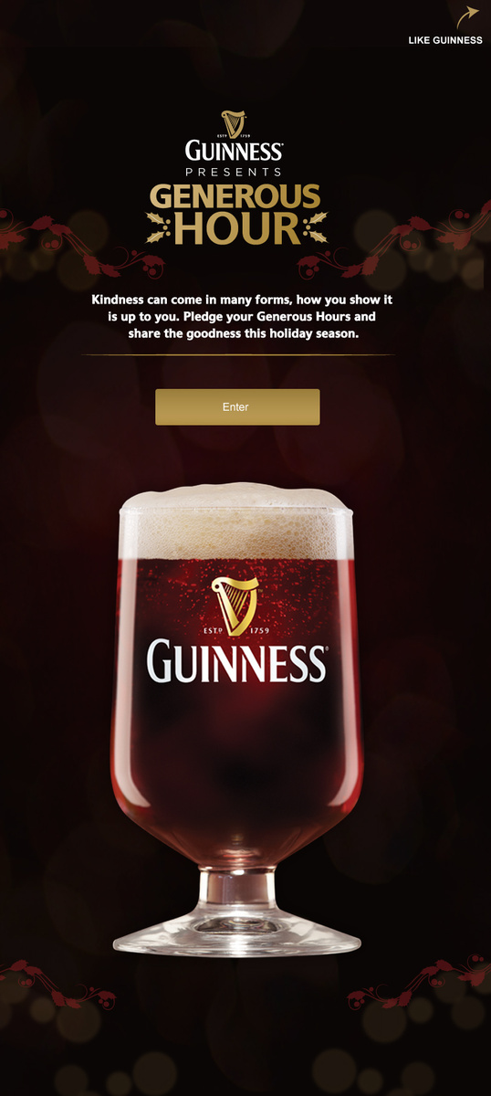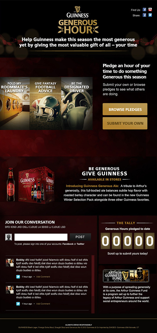 Facebook tab for Guinness Generous Hour. Aside from creating the Generous Hour logo, I concepted the idea for the tab. The initiative was to have fans give guidance and time to people in need - and to promote the sales of Guinness products.