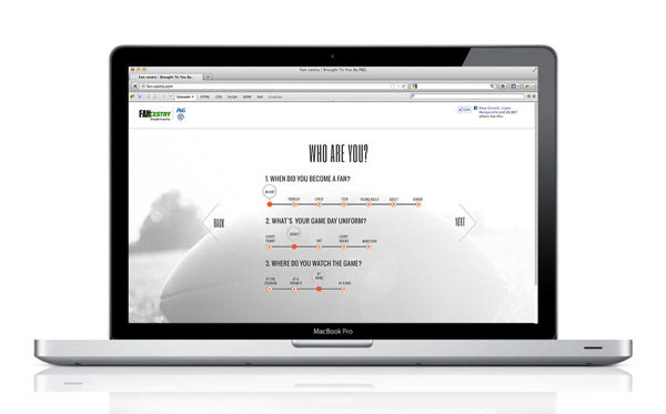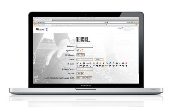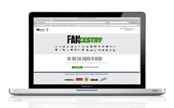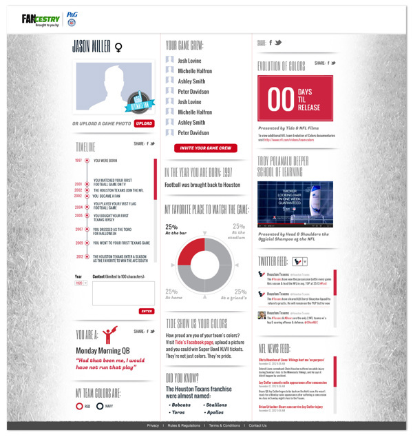 P&G Fan-cestry was created to target NFL fans. The website generated unique profiles for each fan based on questions of their own fandom. The profiles allowed them to track their favorite NFL team's history. The drive: win 2 tickets to Super Bowl XLVII.